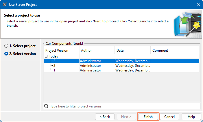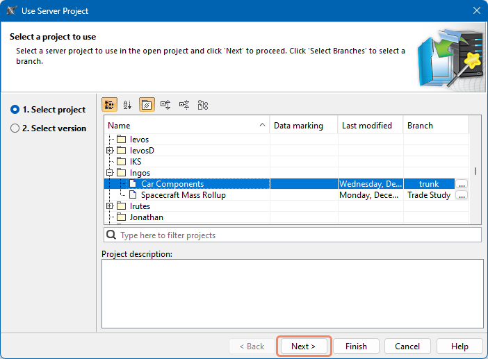 SysML v2 Client-Side Collaboration 2026x Working with used projects Current: Using server projects Using server projects To use a project in another project, you must have the Administer Resources permission. To use a server project in another server projectOpen the Project Usages dialog:In the main menu, select Options > Project Usages.In the main menu, select Collaborate > Project Usages > Project Usages.Click .In the Use Server Project dialog, select the project you want to use and click Next.Select the project version you want to use and click the Finish button.Used projects are displayed under the Used Projects node in the Containment tree and in the Project Usages dialog. ×