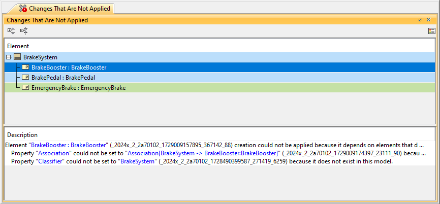 In the Changes That Are Not Applied pane, select each change and read the description explaining the reason of the issue. To avoid such issues, remember to check element dependencies before creating a model patch.