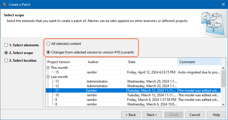 - Changes from specific version. This type of patch adds the selected scope to the target project as concurrent changes. If you select this patch type, also select a project version. All changes from the selected version, subsequent versions, and the current project version will be included in the patch.This patch type is only available for Teamwork Cloud projects.