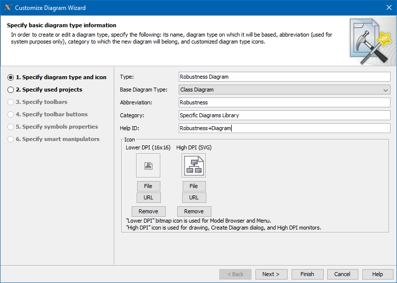 The Customize Diagram Wizard contains the following steps for creating a new diagram type or modifying a chosen one.