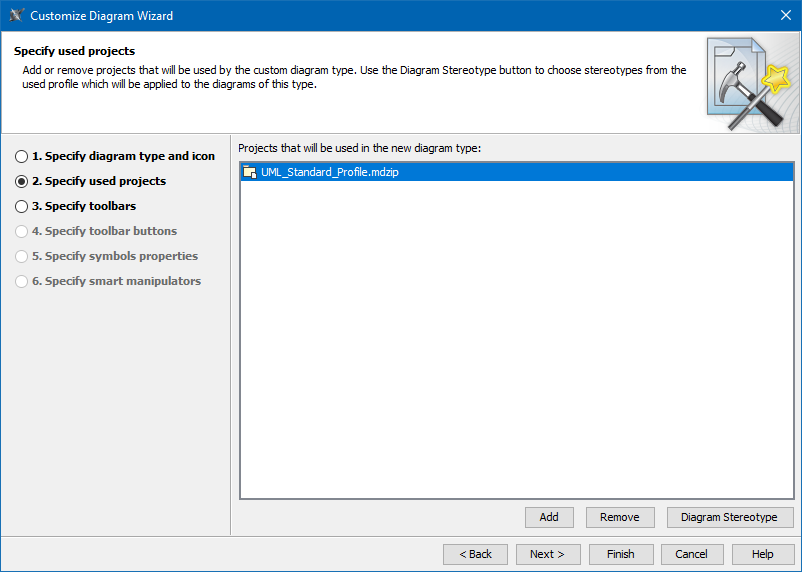 - Do not remove the UML Standard Profile, which is selected by default, from the list. It must be used by any custom diagram type.