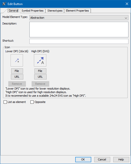 - List as element – select this check box to add the button as a command in the Create Element command list.