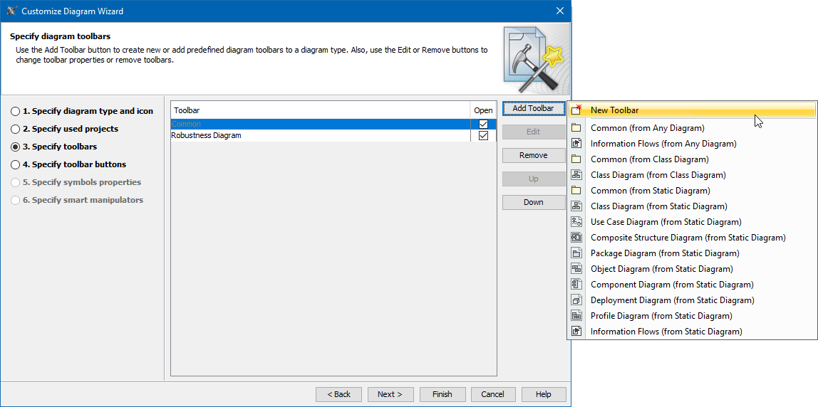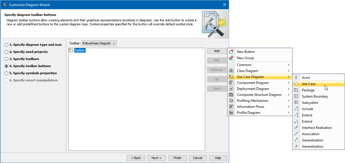 Every diagram differs by the elements used in them. In the Specify toolbars step, you can group standard or custom elements.