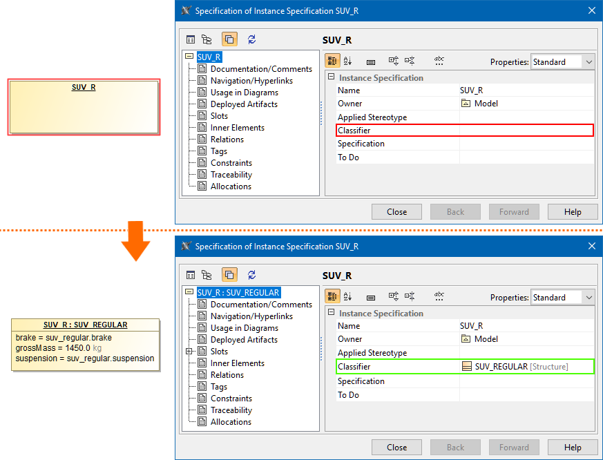 The Instance Specification SUV_R does not have a Classifier specified. The error is resolved by specifying the Classifier.