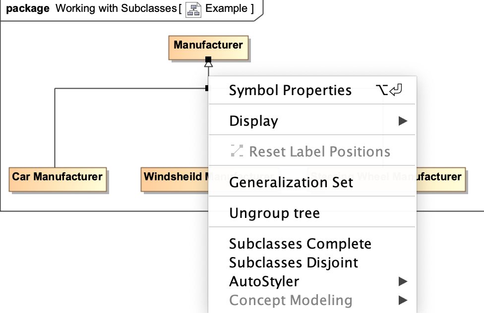 - Starting from MagicDraw 18.3, the Concept Modeling menu options: Make subclasses complete and Make subclasses disjoint have been replaced with Subclasses Complete and Subclasses Disjoint respectively (see the following figure).