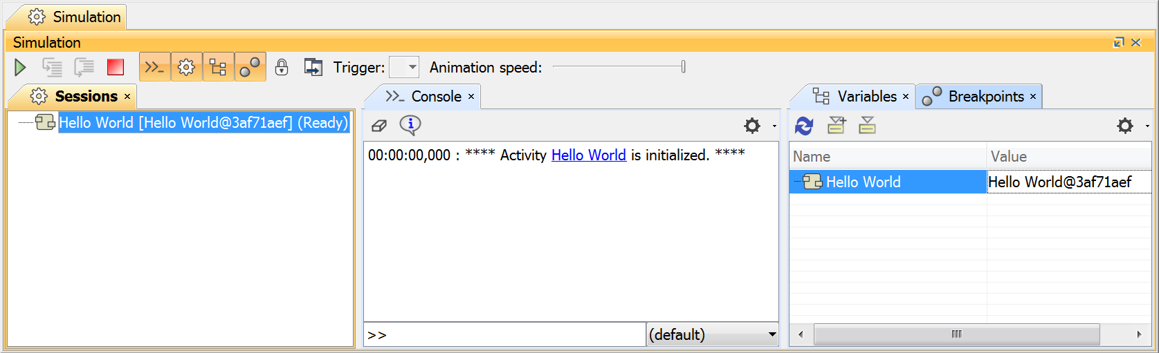 - Right click on Hello World in the Model Browser and select Simulation > Run. The Simulation window will appear, with Hello World listed as "Ready" under the Sessions pane.