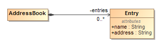 An Entry comprises a name and an address for that name. For our simple model, we will represent this data using name and address attributes of Entry, both of type String.