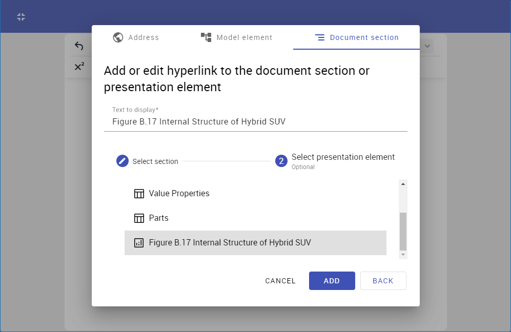 Collaborator for Teamwork Cloud supports hyperlinks to web pages, model elements, and document sections in all string-type values. You can also add cross-references to any part of a document section, including images and tables.