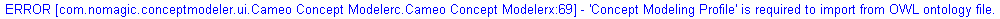 If you are working in a non-CCM project, and you want to import an OWL ontology file (File > Import From > OWL Ontology File), a message dialog appears. The dialog will inform you that the Concept Modeling Profile is required for import, and it will ask you whether or not you want to load it.
