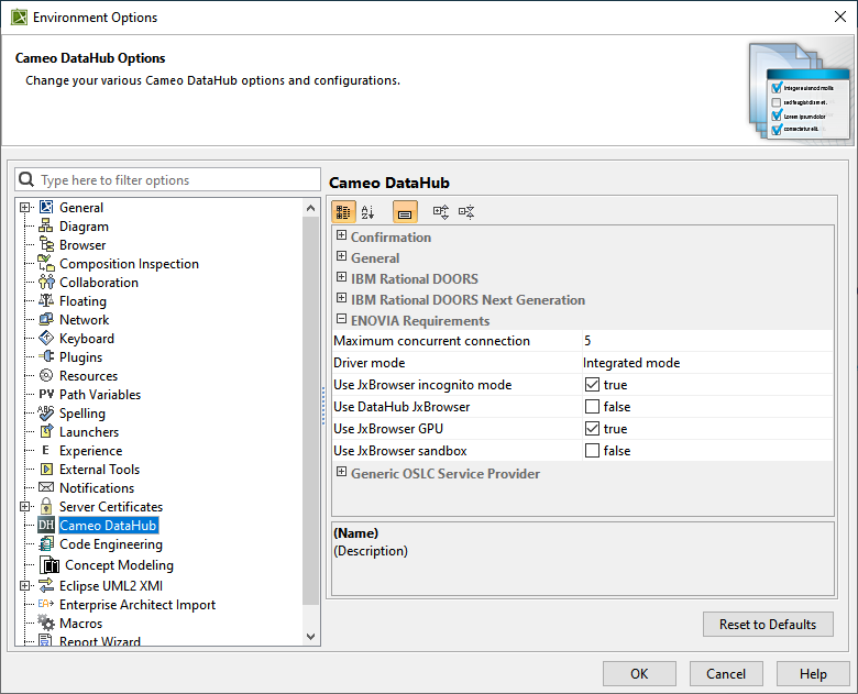 This section explains the ENOVIA Requirements setting in the Cameo DataHub Options dialog.