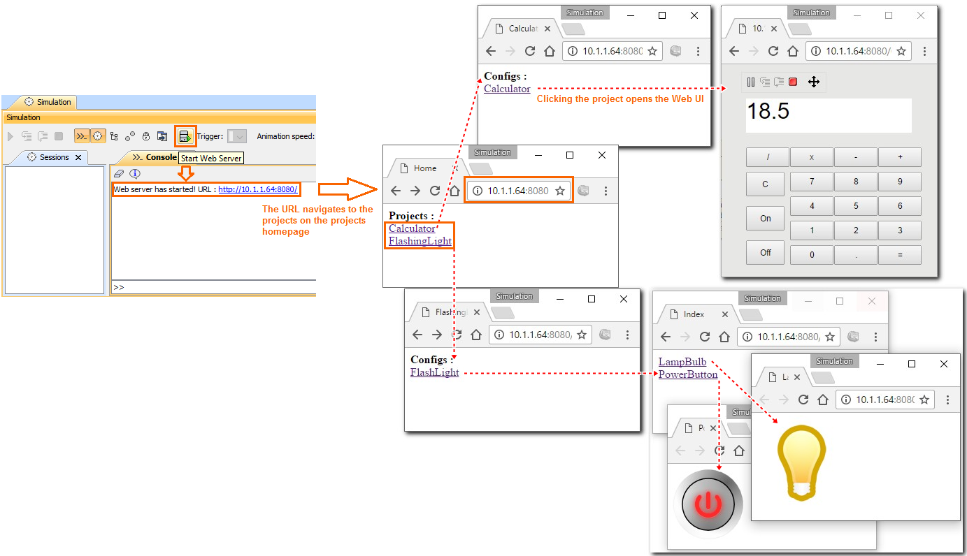 • CST 18.5 allows to expose HTML UI for remote simulation presentations and control. Open projects list can be shown for the remote user. Individual projects can be selected as active. Clicking on an available simulation configuration name starts model execution and automatically shows UI mockups in a web browser.  All this functionality is packed as a separate free "Web Server for Cameo Simulation Toolkit” plugin. (See project list.)