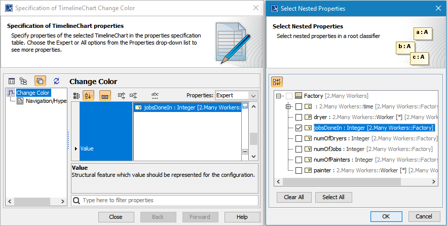- Open its Specification window and click next to the Value property to select the elements/values to be monitored in the Timeline Chart. The Select Nested Properties dialog opens.