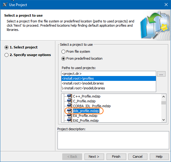 - From predefined location. Select the Paths to used projects: <install.root>\profiles and from the list below, select the dds_profile.mdzip.