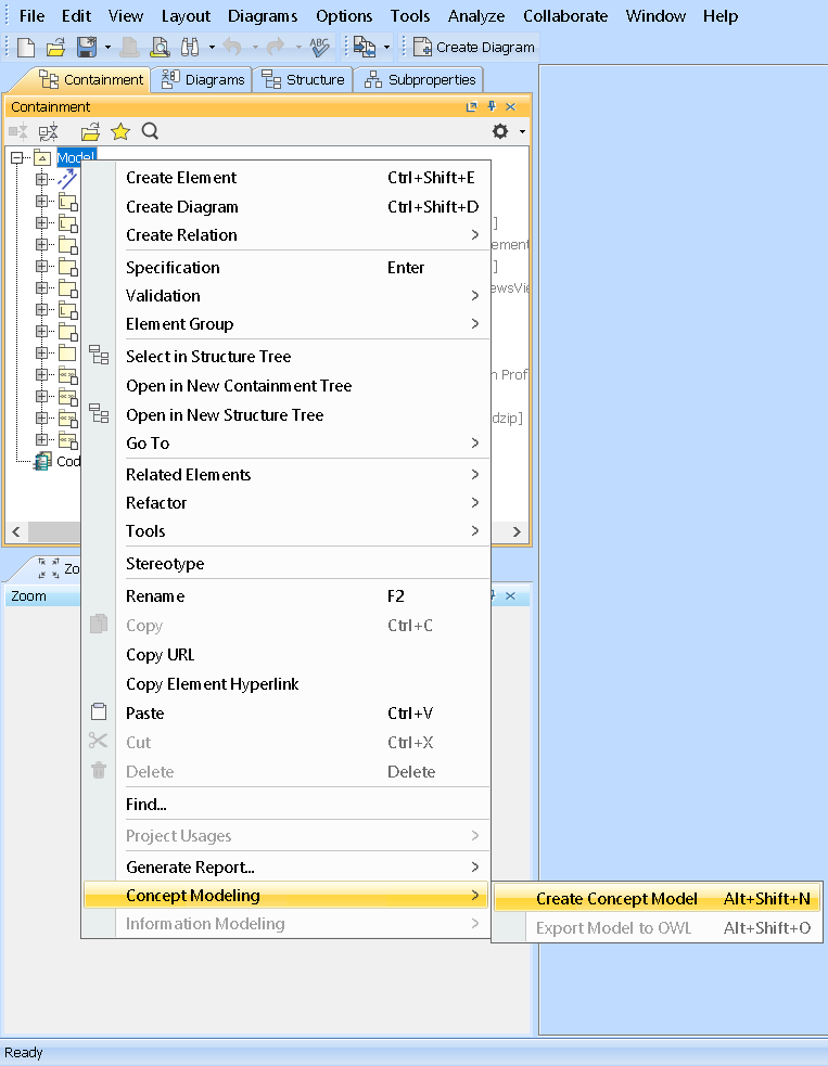 When working with a non-MCM project, e.g. a SysML project, you cannot select the Concept Modeling option.