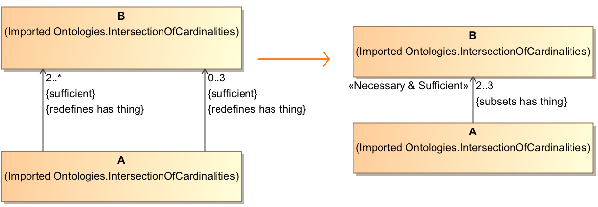 Importing intersected cardinality restrictions on the same property now results in the cardinalities being applied to the same UML property. The diagram illustrates this concept.