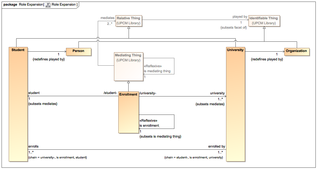 This section is meant to show the support for Association Classes, Roles, and Phases in the modeling tool's UPCM library. Think of the UPCM library as an expanded view of the diagram using Association Class, Role and/or Phase. Examples of UPCM library in the modeling tool are shown below.