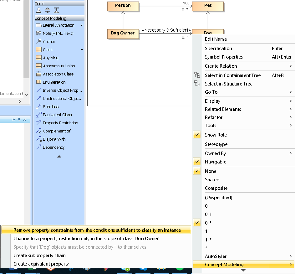 - Right-click on the association end of the property of which the {sufficient} constraint will be removed (unnamed from “Dog Owner”).