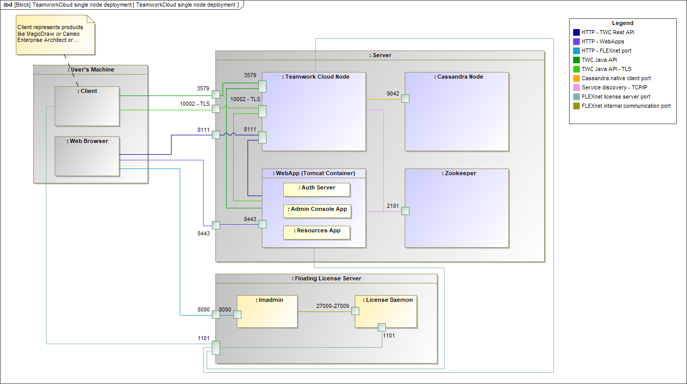 The following sections describe the full deployment of Magic Collaboration Studio on a single Linux server. The deployment includes installation of third-party components: Apache Cassandra database and FlexNet license server. A set of installation scripts are provided to streamline the installation process. This type of all-in-one deployment should be used for testing and evaluation. For a performant system, we recommend distributing components and services on multiple servers.
