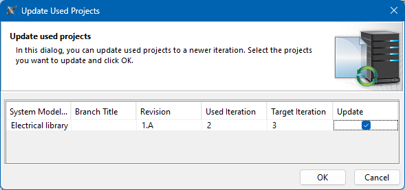 - In the Update column of the open dialog, select the check boxes for the projects you want to update and click OK.