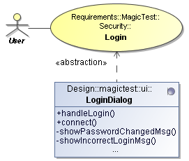 The property shows the use cases (from the Requirements model) representing the class specification.