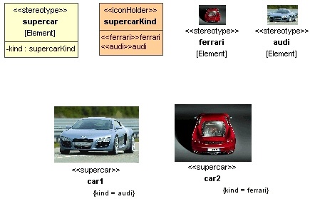 4. Apply stereotypes with different icons to every EnumerationLiteral (in our example, «ferrari» and «audi»).