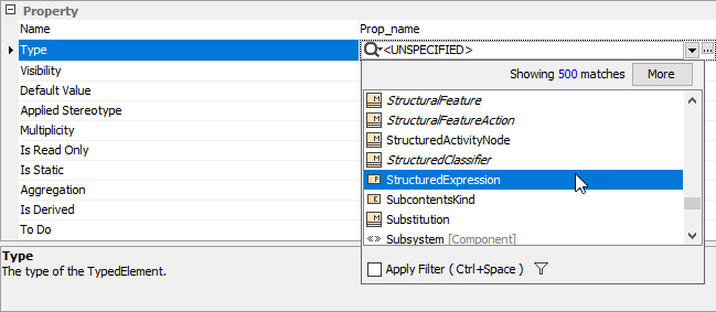 3. Open the Specification window of the tag definition and select the Type property. Click the property specification cell and select the StructuredExpression value as a type.