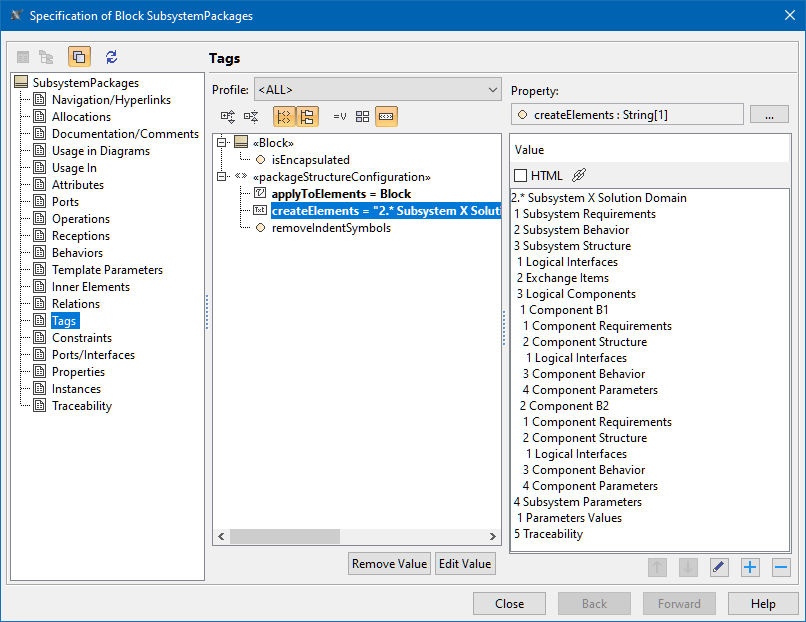 (Optional) If the structure defined in the CreateElements tag is specified using any indent symbols (e.g., bullet points, numbers, etc.) that you do not want to include in the created packages' names, select RemoveIndentSymbols, click the Edit Value button and set it to true.
