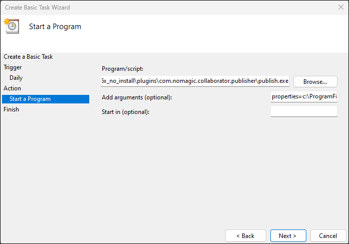 7. In the Add Arguments (optional) box, type properties=<modeling_tool_installation_directory>\plugins\com.nomagic.collaborator.publisher\template.properties and click Next.