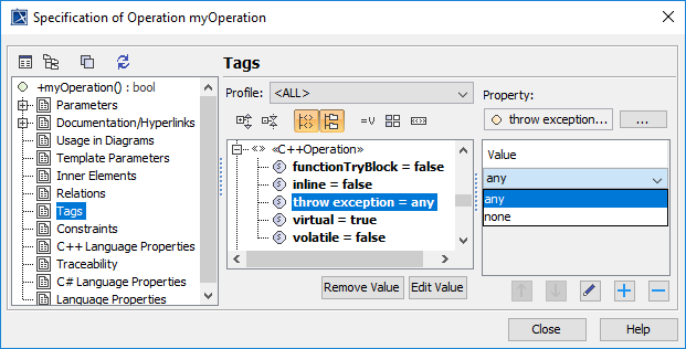 Operation applies the «C++Operation» stereotype in an old profile (C++ Profile) and set the C++ThrownExceptions tag value to any.