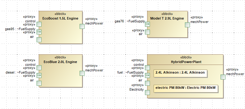 This approach is semantically better than the previous one but suffers from a different problem. Usually, the specific types do have different (albeit similar) ports. E.g., a gasoline engine has a gas input port, while a diesel engine has a diesel input port. If the type of the part is being changed by the element property variation point, then the previous ports displayed on that part are no longer valid. Therefore any of the connectors connecting to those ports are no longer valid. To achieve model validity, any connectors attached to the ports of the original block must be re-routed to the new ports. This could be done in principle (again, using many additional Element Property variation points on the connector ends), but this was so complicated and clumsy as to be hardly usable.