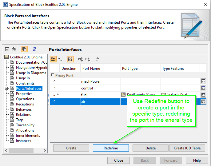 To use the first method, if the ports on the specific block are not yet created, you can use the Redefine button in the Ports/Interfaces section of the specification window of the specific block. This button creates the port in the specific block and links it to the port in the parent block in one go: