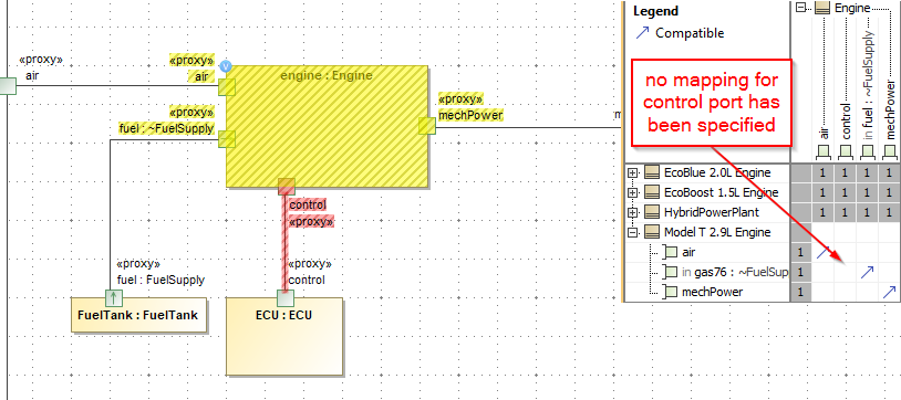 In the example above, the chosen configuration specifies the antique engine type for the engine part. This engine type does not have a control port, and there is no compatibility mapping specified for the control port of the generic Engine type. Therefore the control port will be removed during the variant realization, with the connectors connected to it, and this is indicated in the example above.