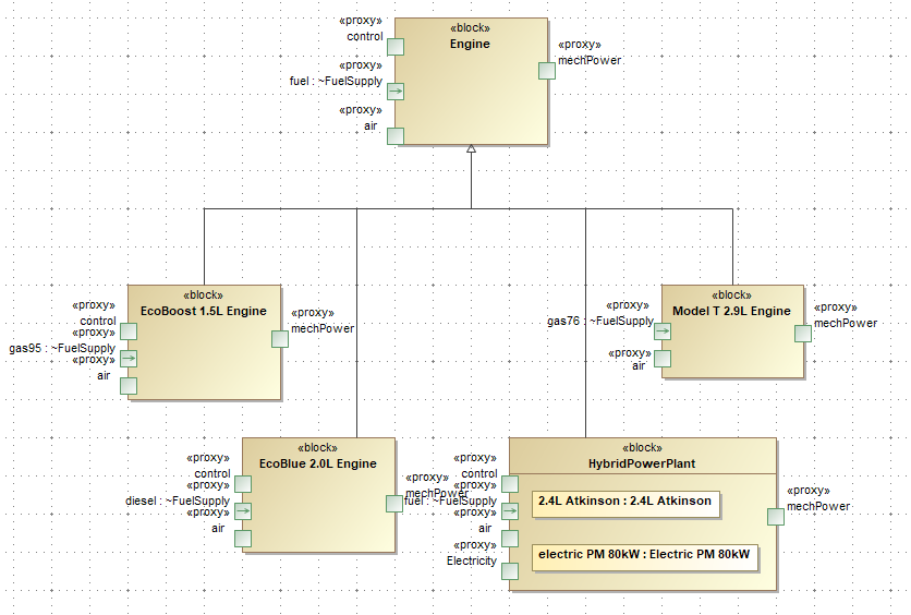 This common abstract block must have a number and type of ports, such that for each port of the concrete blocks that we want to use, there is an equivalent corresponding port in the abstract block. In the example above, we see that the abstract Engine block has four ports, which have equivalent ports in each of the concrete blocks that we want to use.