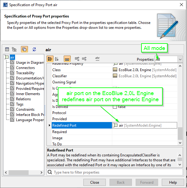 If the ports are already created in the specific block, then redefinition can be specified by opening the specification window of the port on the specific block, switching to the All properties mode, and filling in the redefinedPort field with the port on the general block.
