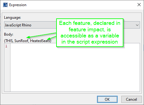 - Either the Expression In this case, the user needs to click the … in the field, and the expression editor will be opened. Pick the expression language (usually the same scripting language is used for variation points across the project – JavaScript Rhino or Jython – consult the company policy) and write the expression using the variables indicated in the header of the expression. Each feature declared in the feature Impact table is accessible as a variable in the script expression. The expression must return true for the condition under which the Element of that particular row will be used for the varying part type/action behavior.