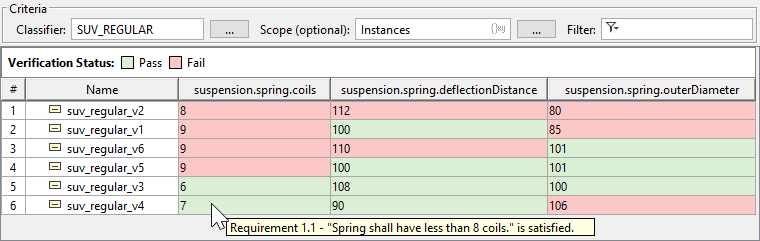 You can also carry out Requirements verification analysis in an Instance table. While the verification in a Requirement table allows you to perform the analysis for a single instance set as the context, the verification in an Instance table allows you to perform the analysis for multiple instances simultaneously via the Enable Patterns-Based Verification option. In an Instance table, the columns represent the properties provided by the classifier specified for the table, and the appropriate cells display the property values specified in the instances you choose to display in the table.