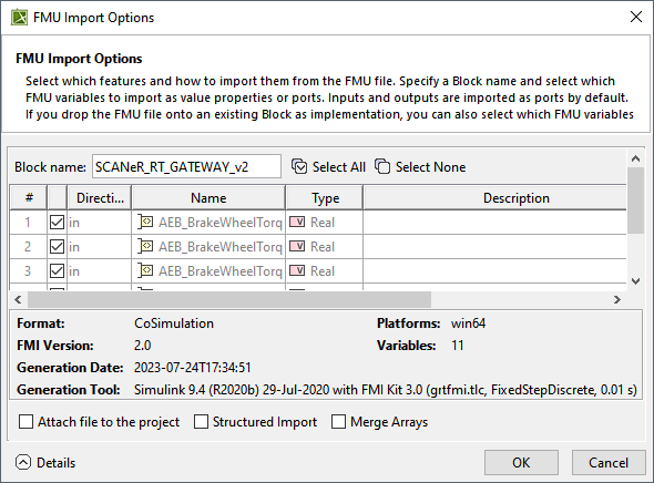 You can view the details about the imported FMU file in the FMU Import Options dialog. Once you click the Details button, the details are displayed in the expanded section of the dialog.