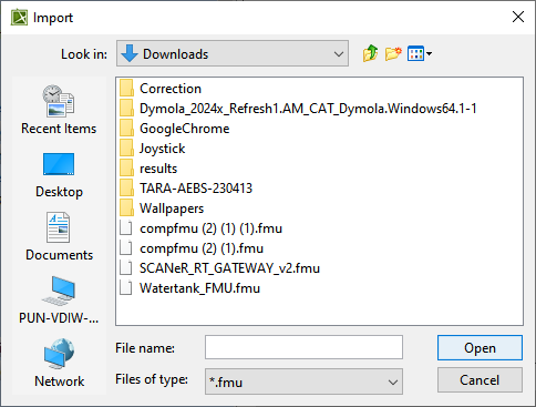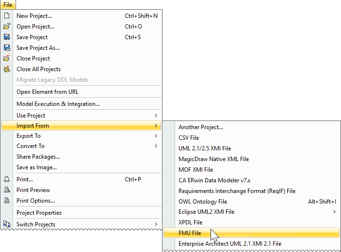 - In the top-left corner of the modeling tool, click File > Import From > FMU File.
