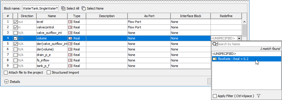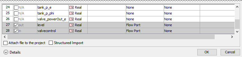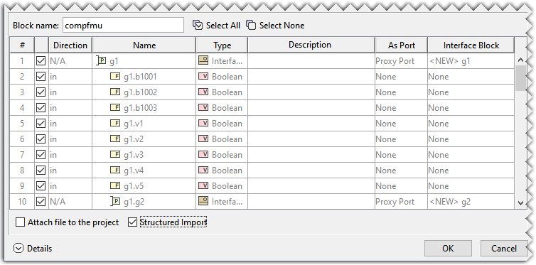If you select the Structured Import checkbox, then the FMU properties are split according to dot notation. The FMU properties are represented as Flow or Value properties, owned by an Interface Block. For structured properties, As Port and Interface Block columns are inactive.