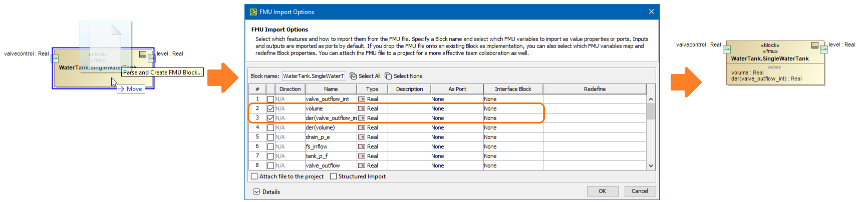 You can drag and drop the FMU file directly onto the Block as implementation as well. Once the FMU file is dropped, the FMU Import Options dialog opens. This dialog allows redefining value and part properties.