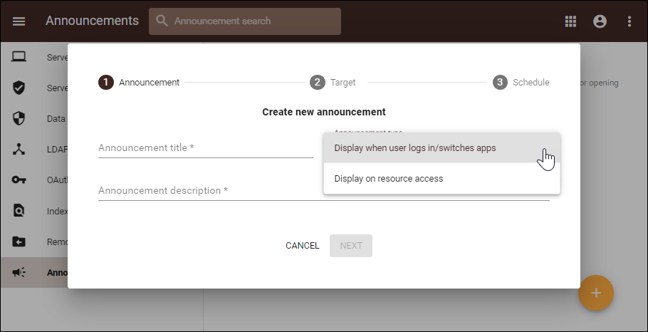 The 2022x Refresh1 version of Teamwork Cloud introduces the ability to set up custom announcements to be shown to users. These announcements can be displayed as notifications when users log into the server or open specified resources both through the modeling tool and web applications. With this feature in place, you can quickly and easily announce early server upgrades, project deadlines, or any other organization-specific information within the tool.