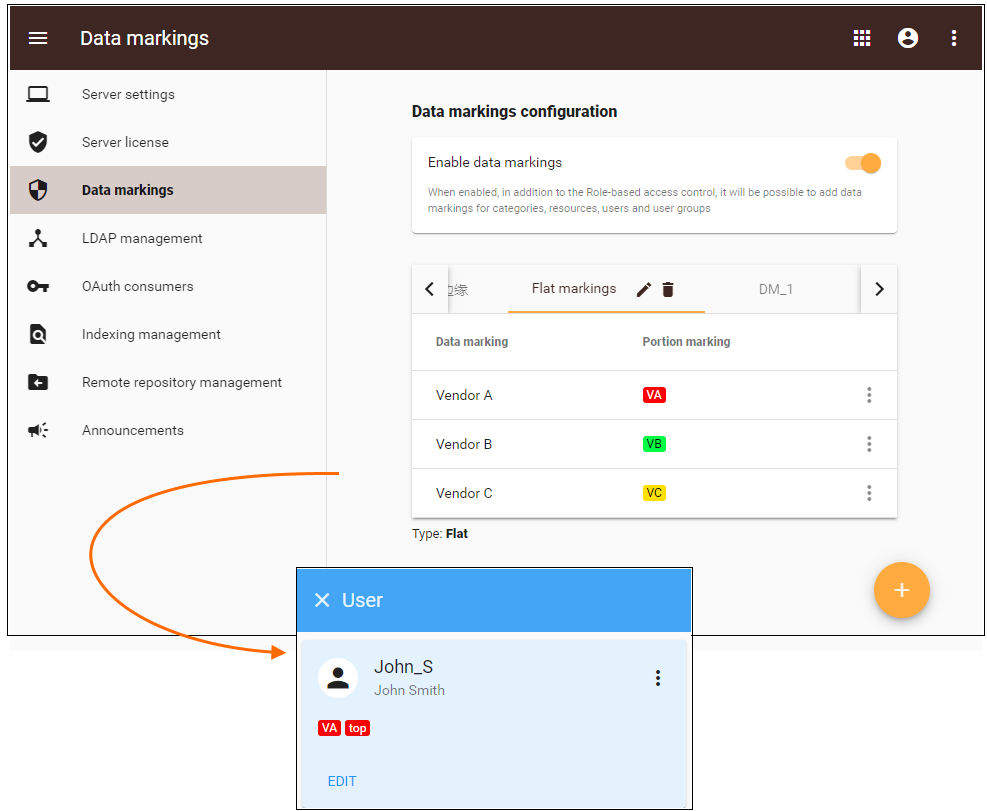 Setting a flat data markings group and viewing a user with both hierarchical and flat markings.