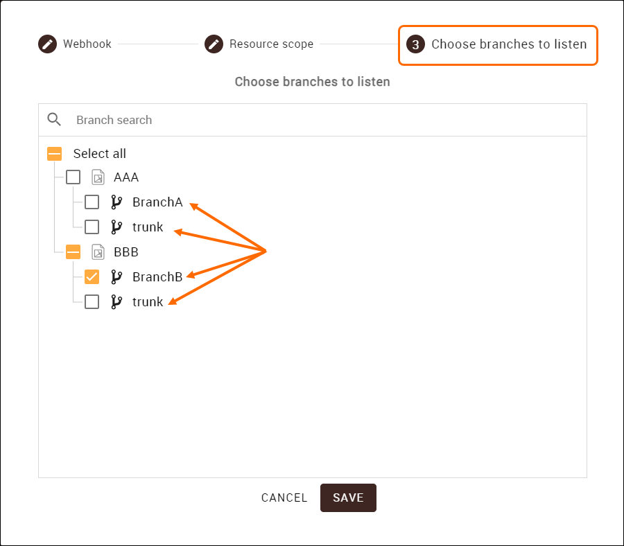 When creating a webhook, you can select the specific branch or branches in which the webhook will listen for events. This enhanced control capability is available for resource-scoped webhooks of the commit or tagged commit event type.