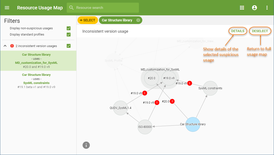 In the Resource Usage Map application, you can detect three types of suspicious usages: inconsistent version usages, cyclic usages, and unused resources. In addition, you can filter and investigate suspicious usages by using the Filters pane. The sections below explain how to do that.