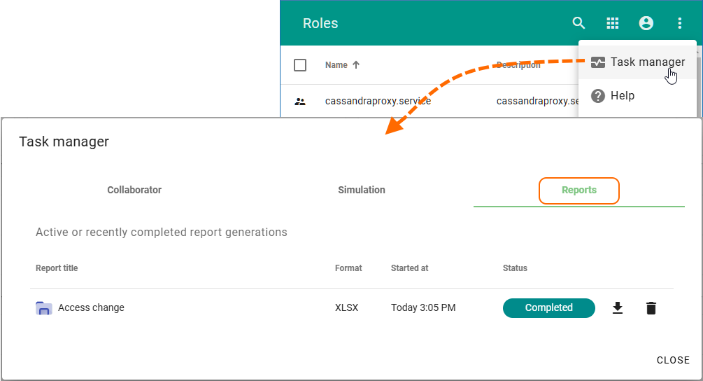 After a report is generated, you can access it from the Task manager dialog, which you can open from every application'smenu, located in the app bar.