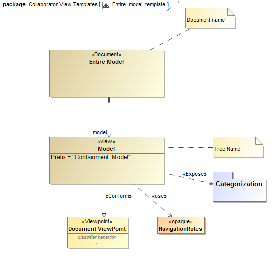 The figure displays the View Diagram of the Entire Model template with a default scope that is specified through the «Expose» dependency.