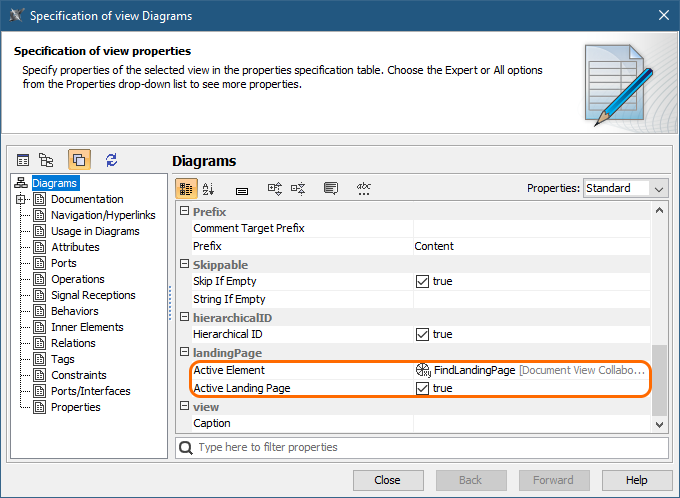 2. Open the Specification window of the View element which will be used to display the diagram you want to set as the home page.