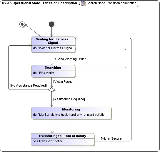 The Operational State Transition Description is a graphical method of describing how an operational node or activity responds to various events by changing its state. The diagram represents the sets of events to which the architecture will respond (by taking an action to move to a new state) as a function of its current state. Each transition specifies an event and an action. The explicit sequencing of activities in response to external and internal events is not fully expressed in an OV-5. An OV-6b can be used to describe the explicit sequencing of the operational activities.