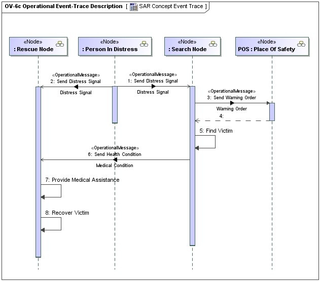 The Operational Event-Trace Description provides a time-ordered examination of the information exchanges between participating operational nodes as a result of a particular operational thread or scenario. Each event-trace diagram should have an accompanying description that defines the particular scenario or situation and represent a specific capability. The OV-6c is also used in conjunction with an OV-5 to depict process flow (such as an IDEF3 model). A process flow model captures precedence and causality relations between situations and events by providing a structured method for expressing knowledge about how a process or organization works. A process flow model should be annotated with the names of the operational nodes responsible for conducting those activities.