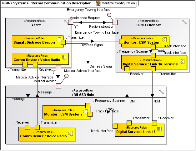• NSV-2 diagram which is based on the UML Composite Structure diagram.